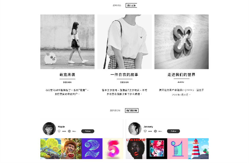騰訊原創(chuàng)館平臺(tái)本身是原創(chuàng)設(shè)計(jì)師的展示平臺(tái),一切內(nèi)容來(lái)自設(shè)計(jì)師群體,因此在界面的呈現(xiàn)上,沒(méi)有過(guò)多的喧賓奪主的點(diǎn)綴裝飾。相較于原版官網(wǎng)設(shè)計(jì)有了更成熟的展示與體驗(yàn)。
