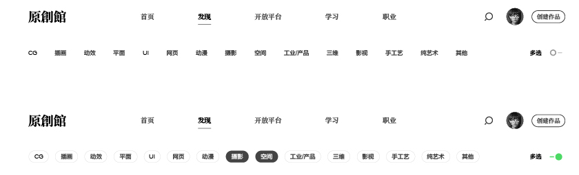 在內(nèi)容篩選方面,新版網(wǎng)站通過(guò)開(kāi)關(guān)形式來(lái)進(jìn)行單選資源分類(lèi)與多選資源分類(lèi)的區(qū)別。在用戶操作形式上,讓用戶免去思考過(guò)濾繁瑣的信息,可以快速篩選內(nèi)容;在視覺(jué)形式上,簡(jiǎn)化了頭部的區(qū)域。